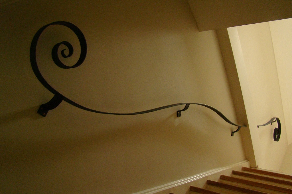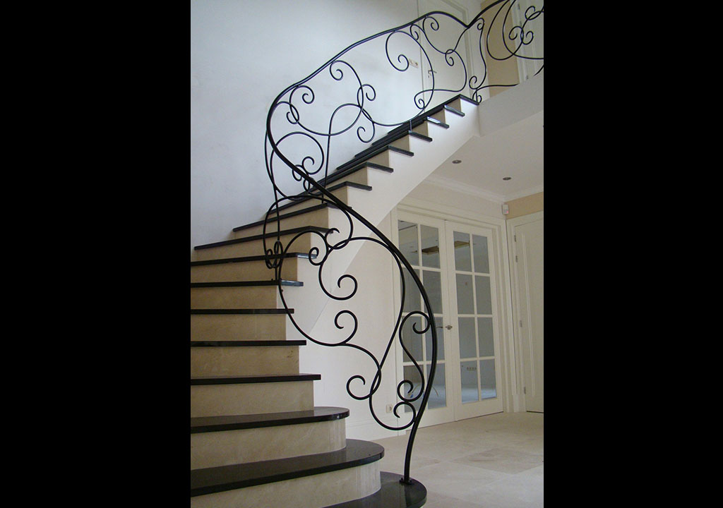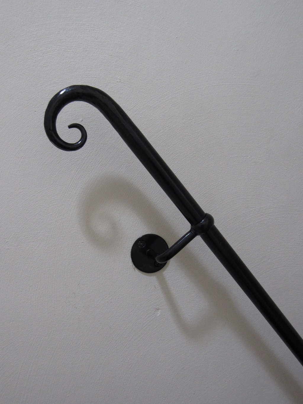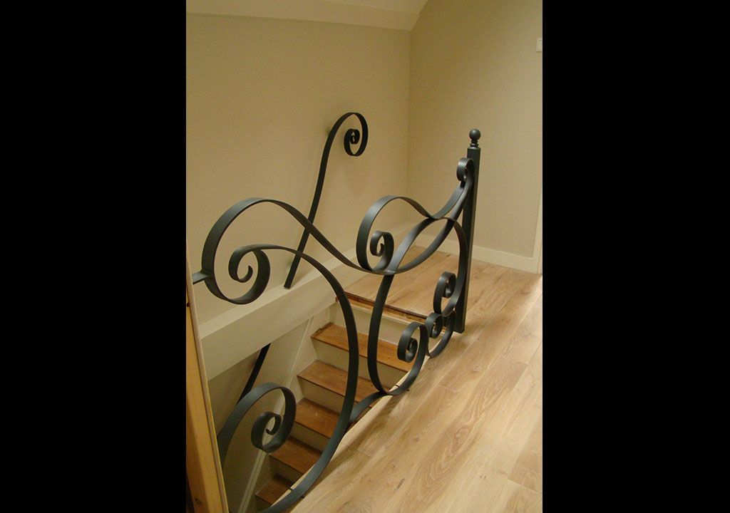 3. Zware massieve leuning waarvan het uiteinde mooi in een klassieke krul zijn uitgesmeed.